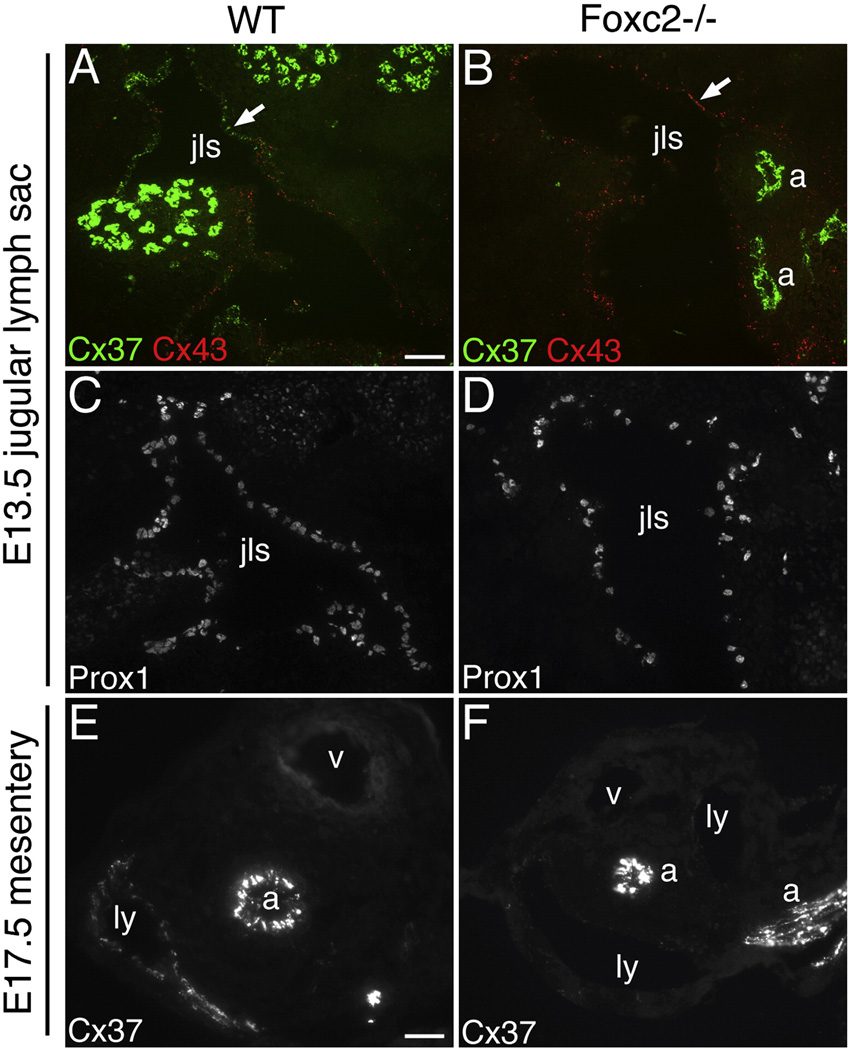 Intraluminal valves are required for the proper function of lymphatic collecting vessels and large lymphatic trunks like the thoracic duct. Despite recent progress in the study of lymphvasculogenesis and lymphangiogenesis, the molecular mechanisms controlling the morphogenesis of lymphatic valves remain poorly understood. Here, we report that gap junction proteins, or connexins (Cxs), are required for lymphatic valvulogenesis. Cx37 and Cx43 are expressed early in mouse lymphatic development in the jugular lymph sacs, and later in development these Cxs become enriched and differentially expressed by lymphatic endothelial cells on the upstream and downstream sides of the valves. Specific deficiencies of Cx37 and Cx43 alone or in combination result in defective valve formation in lymphatic collecting vessels, lymphedema, and chylothorax. We also show that Cx37 regulates jugular lymph sac size and that both Cx37 and Cx43 are required for normal thoracic duct development, including valve formation. Another Cx family member, Cx47, whose human analog is mutated in some families with lymphedema, is also highly enriched in a subset of endothelial cells in lymphatic valves. Mechanistically, we present data from Foxc2-/- embryos suggesting that Cx37 may be a target of regulation by Foxc2, a transcription factor that is mutated in human lymphedema-distichiasis syndrome. These results show that at least three Cxs are expressed in the developing lymphatic vasculature and, when defective, are associated with clinically manifest lymphatic disorders in mice and man.
