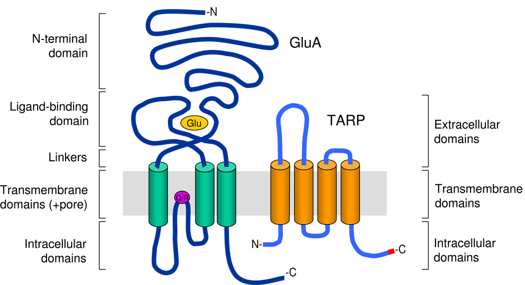 Ionotropic glutamate receptors (iGluRs) underlie rapid, excitatory synaptic signaling throughout the CNS. After years of intense research, our picture of iGluRs has evolved from them being companionless in the postsynaptic membrane to them being the hub of dynamic supramolecular signaling complexes, interacting with an ever-expanding litany of other proteins that regulate their trafficking, scaffolding, stability, signaling, and turnover. In particular, the discovery that transmembrane AMPA receptor regulatory proteins (TARPs) are AMPA receptor auxiliary subunits that are critical determinants of their trafficking, gating, and pharmacology has changed the way we think about iGluR function. Recently, a number of novel transmembrane proteins have been uncovered that may also serve as iGluR auxiliary proteins. Here we review pivotal developments in our understanding of the role of TARPs in AMPA receptor trafficking and gating, and provide an overview of how newly discovered transmembrane proteins expand our view of iGluR function in the CNS.