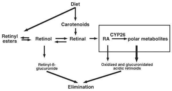 The active metabolite of vitamin A, retinoic acid (RA), is a powerful regulator of gene transcription. RA is also a therapeutic drug. The oxidative metabolism of RA by certain members of the cytochrome P450 (CYP) superfamily helps to maintain tissue RA concentrations within appropriate bounds. The CYP26 family--CYP26A1, CYP26B1, and CYP26C1--is distinguished by being both regulated by and active toward all-trans-RA (at-RA) while being expressed in different tissue-specific patterns. The CYP26A1 gene is regulated by multiple RA response elements. CYP26A1 is essential for embryonic development, whereas CYP26B1 is essential for postnatal survival as well as germ cell development. Enzyme kinetic studies have demonstrated that several CYP proteins are capable of metabolizing at-RA; however, it is likely that CYP26A1 plays a major role in RA clearance. Thus, pharmacological approaches to limiting the activity of CYP26 enzymes may extend the half-life of RA and could be useful clinically in the future.