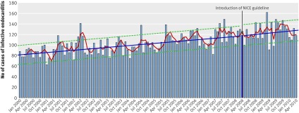 Results: After the introduction of the NICE guideline there was a highly significant 78.6% reduction (P < 0.001) in prescribing of antibiotic prophylaxis, from a mean 10,277 (SD 1068) prescriptions per month to 2292 (SD 176). Evidence that the general upward trend in cases of infective endocarditis before the guideline was significantly altered after the guideline was lacking (P = 0.61). Using a non-inferiority test, an increase in the number of cases of 9.3% or more could be excluded after the introduction of the guideline. Similarly an increase in infective endocarditis related deaths in hospital of 12.3% or more could also be excluded.