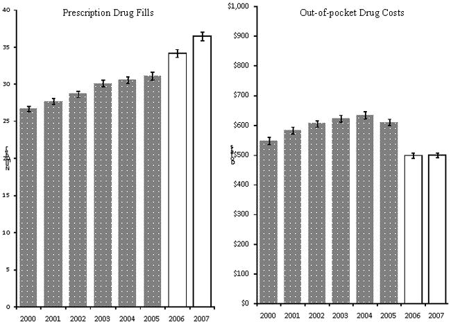 Results: We observed significant average per person increases of 1.8 prescription fills [95% confidence interval (CI), 1.1-2.5] in 2006 and 3.4 prescription fills (95% CI, 2.7-4.1) in 2007 above pre-Part D increases of 0.9 prescription fills per year. Average out-of-pocket drug costs decreased significantly by $143 (95% CI, -182.5--103.1) in 2006 and $148 (95% CI, -181.2--114.1) in 2007 above average pre-Part D increases of $12 per year. Prescription fills did not change for beneficiaries with fair to poor health until 2007 when large increases occurred (increases of 3.7 to 11.0 fills above pre-Part D trends). Significant reductions in OOP drug costs occurred in 2006 and persisted into 2007 across all groups except for sick and poor beneficiaries without Medicaid.