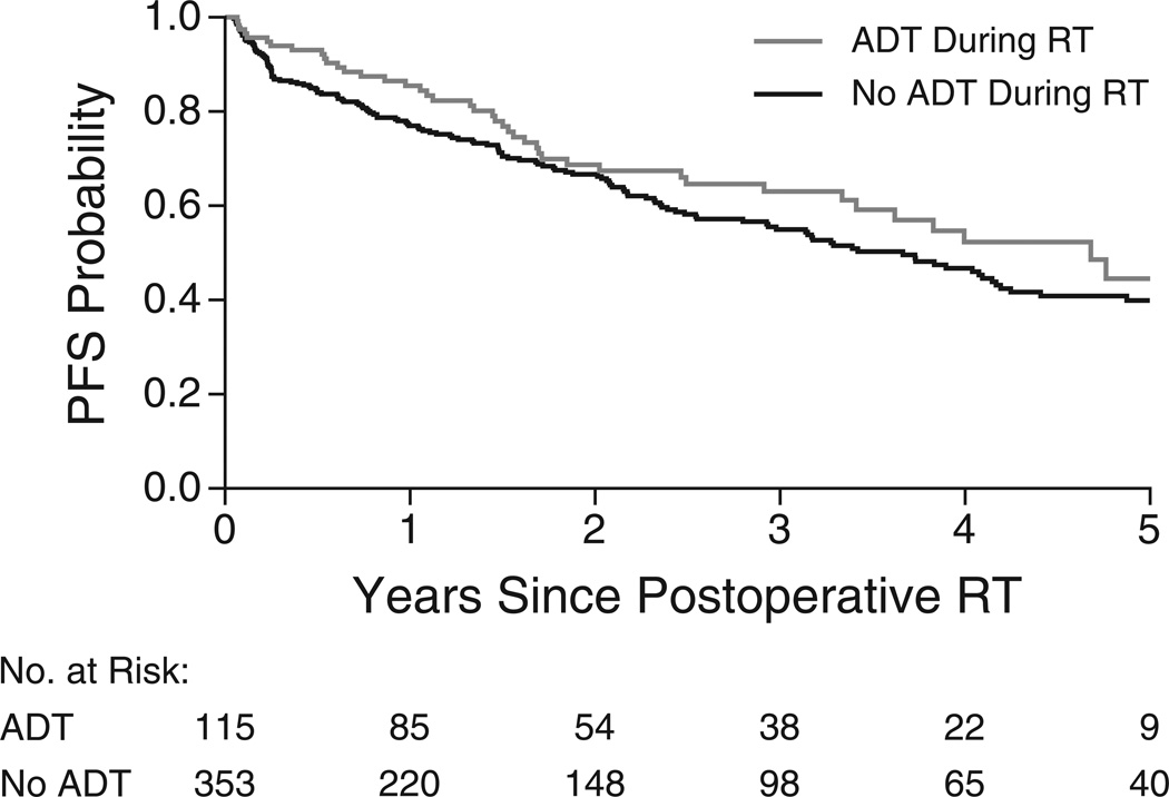 Results: Low-, intermediate-, and high-risk patients made up 10%, 24%, and 66% of patients, respectively. The mean RT dose was 68 Gy. Twenty-four percent of patients received concurrent ADT (cADT). Regional pelvic nodes were treated in 16% of patients. With a median follow-up of 3 years, the 3-year PFS was 4.0 years for cADT vs. 3.4 years for cADT patients (p = 0.22). Multivariate analysis showed that concurrent ADT (p = 0.05), Gleason score (p < 0.001), and pre-RT PSA (p = 0.03) were independent predictors of PFS. When patients were stratified by risk group, the benefits of cADT (hazard ratio, 0.65; p = 0.046) were significant only for high-risk patients.