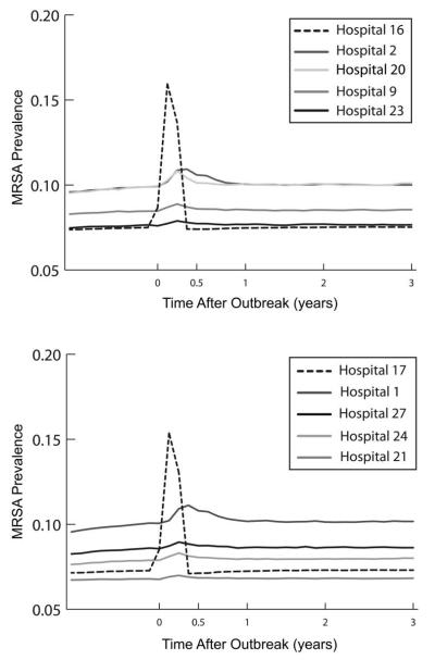 Results: Each simulated outbreak eventually affected all of the hospitals in the network, with effects depending on the outbreak size and location. Increasing MRSA prevalence at a single hospital (from 5% to 15%) resulted in a 2.9% average increase in relative prevalence at all other hospitals (ranging from no effect to 46.4%). Single-hospital intensive care unit outbreaks (modeled increase from 5% to 15%) caused a 1.4% average relative increase in all other OC hospitals (ranging from no effect to 12.7%).