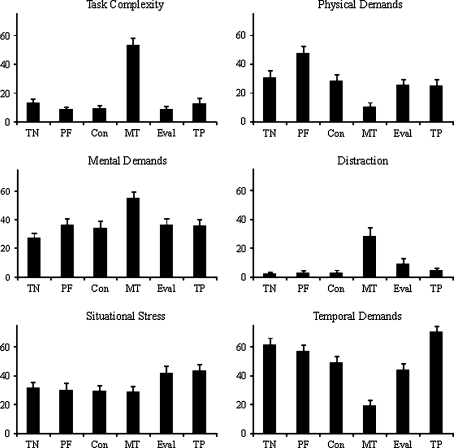Methods: The dimensions of the SURG-TLX were based on two current multidimensional workload measures and developed via focus group discussion. The six dimensions were defined as mental demands, physical demands, temporal demands, task complexity, situational stress, and distractions. Thirty novices were trained on the Fundamentals of Laparoscopic Surgery (FLS) peg transfer task and then completed the task under various conditions designed to manipulate the degree and source of stress experienced: task novelty, physical fatigue, time pressure, evaluation apprehension, multitasking, and distraction.