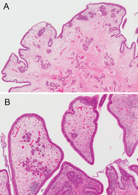 The sinonasal tract is a complex anatomic site, home to a wide variety of reactive, inflammatory, benign, and malignant lesions. Inflammatory polyps and papillomas are usually easily recognized by pathologists. A poorly understood lesion that has been more clearly defined in recent years is the nasal hamartoma. The epithelial subtypes include seromucinous hamartoma, respiratory epithelial adenomatoid hamartoma, and hybrid lesions. Seromucinous hamartomas have only been recognized and substantially reported over the past few years. They are a diagnostic challenge, needing to be distinguished from low grade adenocarcinomas, and are of interest because most of the basic questions about their pathophysiology remain unanswered. Herein, we present two novel cases of seromucinous hamartoma with features that partly expand the morphologic spectrum of these lesions, discuss the differential diagnosis, and review the literature to compare our findings with previously reported cases with the aim of better understanding this interesting entity.