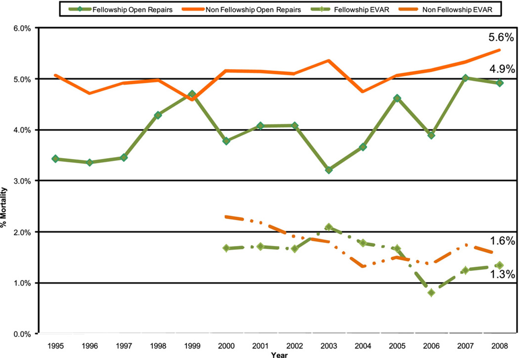 Methods: We identified all Medicare beneficiaries with a diagnosis of AAA who underwent repair or had a primary diagnosis of rupture (1995-2008). Cohorts were compared by type of repair (open vs EVAR) and presentation (intact vs ruptured AAA). Demographics of age, sex, and race were evaluated. We used unique hospital identifier codes to compare trends and 30-day mortality between hospitals that participate in vascular surgery fellowship training and those that do not. American Council on Graduate Medical Education data, only available for the years 1999 to 2008, were further used to better understand the changes in number of EVAR and open repairs of AAA performed each year for vascular fellows and general surgery residents, over time.