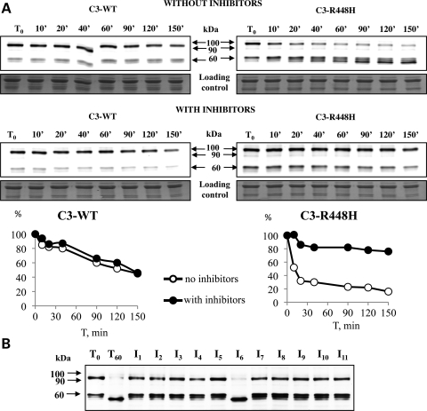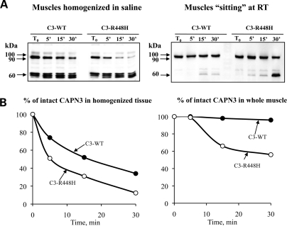 Calpain 3 (CAPN3) is a muscle-specific, calcium-dependent proteinase that is mutated in Limb Girdle Muscle Dystrophy type 2A. Most pathogenic missense mutations in LGMD2A affect CAPN3's proteolytic activity; however, two mutations, D705G and R448H, retain activity but nevertheless cause muscular dystrophy. Previously, we showed that D705G and R448H mutations reduce CAPN3s ability to bind to titin in vitro. In this investigation, we tested the consequence of loss of titin binding in vivo and examined whether this loss can be an underlying pathogenic mechanism in LGMD2A. To address this question, we created transgenic mice that express R448H or D705G in muscles, on wild-type (WT) CAPN3 or knock-out background. Both mutants were readily expressed in insect cells, but when D705G was expressed in skeletal muscle, it was not stable enough to study. Moreover, the D705G mutation had a dominant negative effect on endogenous CAPN3 when expressed on a WT background. The R448H protein was stably expressed in muscles; however, it was more rapidly degraded in muscle extracts compared with WT CAPN3. Increased degradation of R448H was due to non-cysteine, cellular proteases acting on the autolytic sites of CAPN3, rather than autolysis. Fractionation experiments revealed a significant decrease of R448H from the myofibrillar fraction, likely due to the mutant's inability to bind titin. Our data suggest that R448H and D705G mutations affect both CAPN3s anchorage to titin and its stability. These studies reveal a novel mechanism by which mutations that spare enzymatic activity can still lead to calpainopathy.