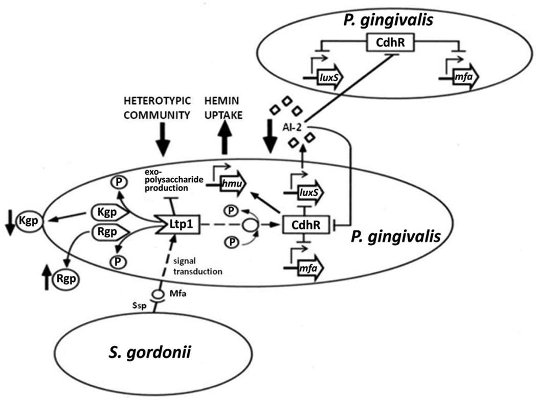 The mitis group streptococci (MGS) are widespread in the oral cavity and are traditionally associated with oral health. However, these organisms have many attributes that contribute to the development of pathogenic oral communities. MGS adhere rapidly to saliva-coated tooth surfaces, thereby providing an attachment substratum for more overtly pathogenic organisms such as Porphyromonas gingivalis, and the two species assemble into heterotypic communities. Close physical association facilitates physiologic support, and pathogens such as Aggregatibacter actinomycetemcomitans display resource partitioning to favour carbon sources generated by streptococcal metabolism. MGS exchange information with community members through a number of interspecies signalling systems including AI-2 and contact dependent mechanisms. Signal transduction systems induced in P. gingivalis are based on protein dephosphorylation mediated by the tyrosine phosphatase Ltp1, and converge on a LuxR-family transcriptional regulator, CdhR. Phenotypic responses in P. gingivalis include regulation of hemin uptake systems and gingipain activity, processes that are intimately linked to the virulence of the organism. Furthermore, communities of S. gordonii with P. gingivalis or with A. actinomycetemcomitans are more pathogenic in animal models than the constituent species alone. We propose that MGS should be considered accessory pathogens, organisms whose pathogenic potential only becomes evident in the context of a heterotypic microbial community.