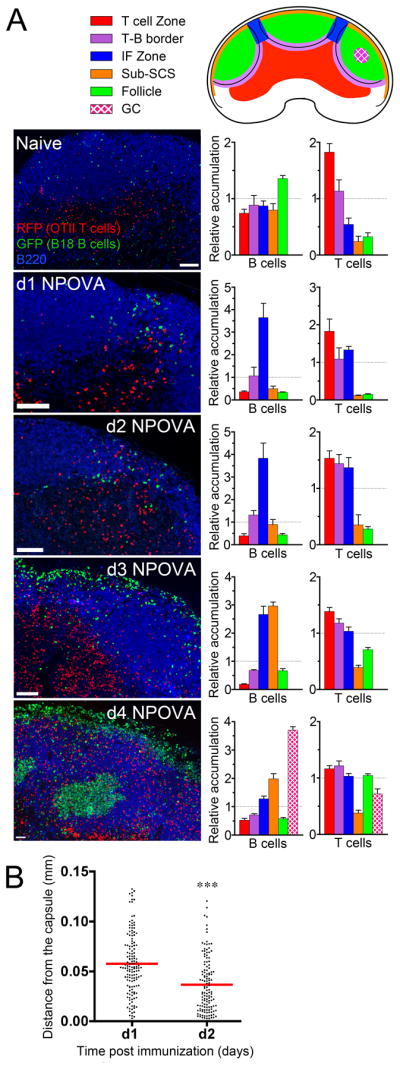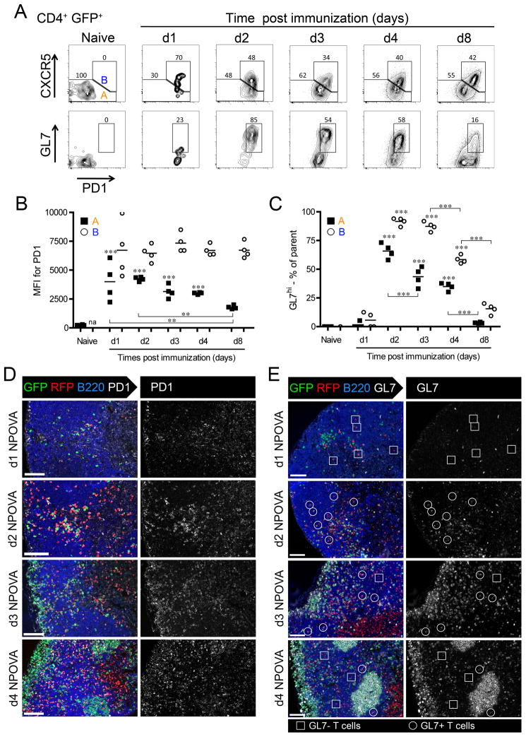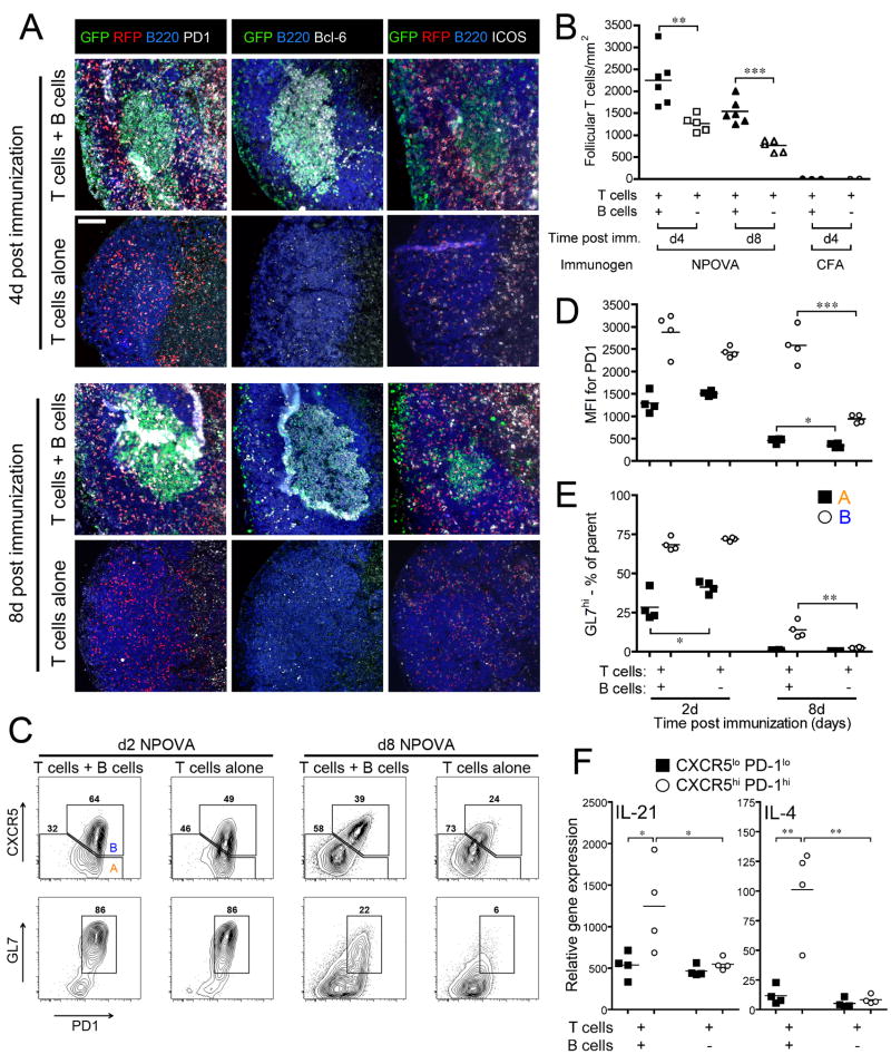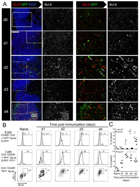 We identify the interfollicular (IF) zone as the site where germinal center B cell and T follicular helper (Tfh) cell differentiation initiates. For the first 2 days postimmunization, antigen-specific T and B cells remained confined within the IF zone, formed long-lived interactions, and upregulated the transcriptional repressor Bcl6. T cells also acquired the Tfh cell markers CXCR5, PD-1, and GL7. Responding B and T cells migrated to the follicle interior directly from the IF zone, T cell immigration preceding B cells by 1 day. Notably, in the absence of cognate B cells, Tfh cells still formed and migrated to the follicle. However, without such B cells, PD-1, ICOS, and GL7 were no longer expressed on follicular Bcl6(hi) T cells that nevertheless persisted in the follicle. Thus, Ag-specific B cells are required for the maintenance of the PD-1(hi)ICOS(hi)GL7(hi) Tfh cell phenotype within the follicle, but not for their initial differentiation in the IF zone.