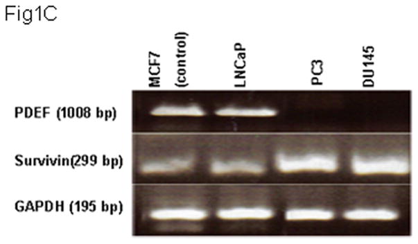 Methods: Tissue microarrays of 73 prostate carcinomas and their adjacent benign prostate tissue, as well as 50 benign prostates were evaluated for PDEF expression by immunohistochemistry. Results were confirmed in available tumor tissues using Western blot and RT-PCR. Expression of survivin in prostate carcinoma and benign tissues were determined using Western blot. Results and correlation with clinical data were statistically analyzed.