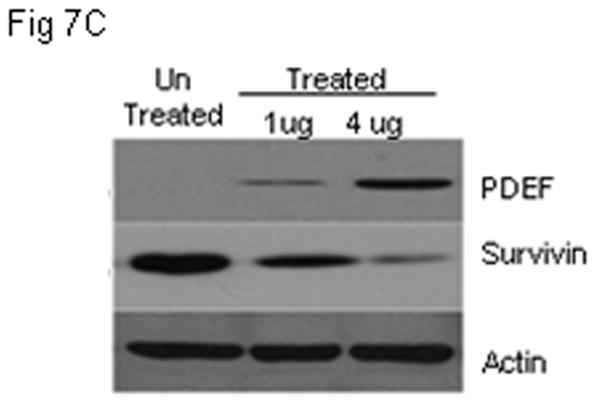 Results: Patients' specimens with low Gleason scores (GS < 5) expressed higher levels of PDEF protein and lower levels of survivin protein when compared with moderate-to-high GS tumors (GS > 6). Patients with PDEF-positive tumor survived significantly longer (P < 0.0001) than patients with PDEF-negative tumor, and the 8-year survival rate was 94% and 40%, respectively. PDEF expression was detected at the highest levels in benign tissues and was down-regulated or lost in 30 recently diagnosed prostate carcinomas. Re-expression of PDEF in prostate cancer cells inhibited survivin expression. Treatment of prostate cancer cells with methylseleninic acid resulted in restoration of PDEF expression, down-regulation of survivin, and inhibition of tumor cell growth when compared with untreated controls (P < 0.05).