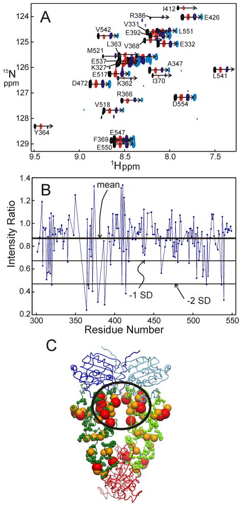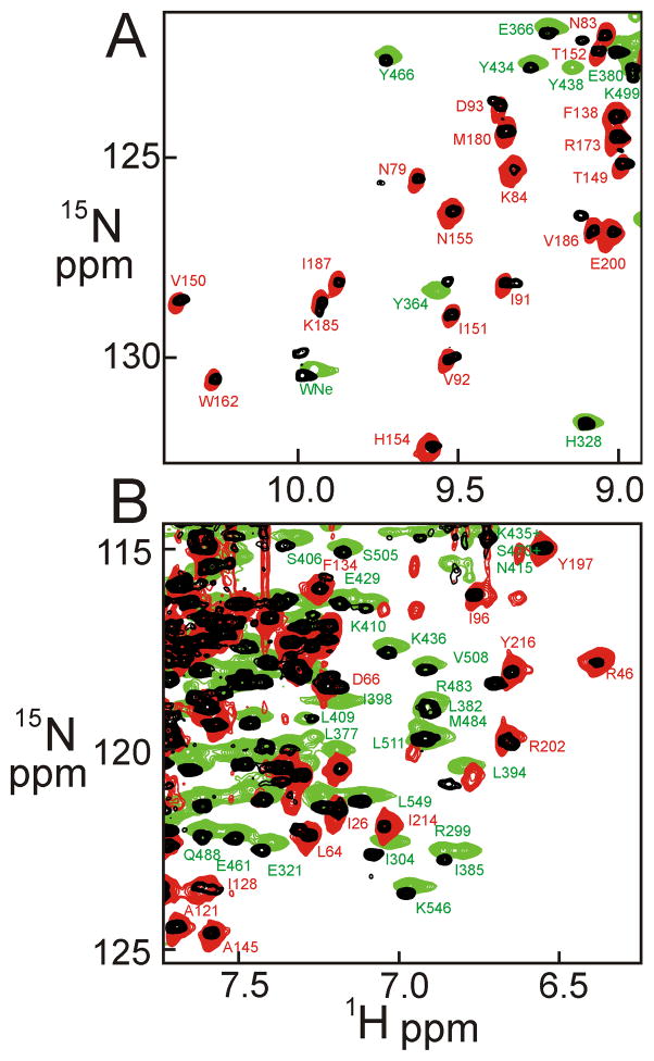 Although the structure of the molecular chaperone Hsp90 has been extensively characterized by X-ray crystallography, the nature of the interactions between Hsp90 and its client proteins remains unclear. We present results from a series of spectroscopic studies that strongly suggest that these interactions are highly dynamic in solution. Extensive NMR assignments have been made for human Hsp90 through the use of specific isotopic labeling of one- and two-domain constructs. Sites of interaction of a client protein, the p53 DNA-binding domain, were then probed both by chemical shift mapping and by saturation transfer NMR spectroscopy. Specific spectroscopic changes were small and difficult to observe, but were reproducibly measured for residues over a wide area of the Hsp90 surface in the N-terminal, middle and C-terminal domains. A somewhat greater specificity, for the area close to the interface between the N-terminal and middle domains of Hsp90, was identified in saturation transfer experiments. These results are consistent with a highly dynamic and nonspecific interaction between Hsp90 and p53 DNA-binding domain in this chaperone-client system, which results in changes in the client protein structure that are detectable by spectroscopic and other methods.