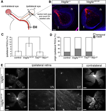 During development, the axons of retinal ganglion cell (RGC) neurons must decide whether to cross or avoid the midline at the optic chiasm to project to targets on both sides of the brain. By combining genetic analyses with in vitro assays, we show that neuropilin 1 (NRP1) promotes contralateral RGC projection in mammals. Unexpectedly, the NRP1 ligand involved is not an axon guidance cue of the class 3 semaphorin family, but VEGF164, the neuropilin-binding isoform of the classical vascular growth factor VEGF-A. VEGF164 is expressed at the chiasm midline and is required for normal contralateral growth in vivo. In outgrowth and growth cone turning assays, VEGF164 acts directly on NRP1-expressing contralateral RGCs to provide growth-promoting and chemoattractive signals. These findings have identified a permissive midline signal for axons at the chiasm midline and provide in vivo evidence that VEGF-A is an essential axon guidance cue.