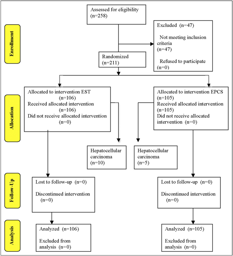 Methods: Two hundred eleven unselected patients with cirrhosis and BEV were randomized to endoscopic sclerotherapy (n = 106) or emergency portacaval shunt (n = 105). Diagnostic workup and treatment were initiated within 8 hours. Ninety-six percent had >10 years of follow-up. HCC screening involved serum α-fetoprotein (AFP) every 3 months, ultrasonography every 6 months, and selective computed tomography (CT).