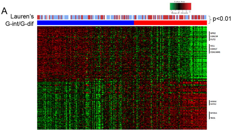 Results: Unsupervised cell line analysis identified 2 major intrinsic genomic subtypes (G-INT and G-DIF) that had distinct patterns of gene expression. The intrinsic subtypes, but not subtypes based on Lauren's histopathologic classification, were prognostic of survival, based on univariate and multivariate analysis in multiple patient cohorts. The G-INT cell lines were significantly more sensitive to 5-fluorouracil and oxaliplatin, but more resistant to cisplatin, than the G-DIF cell lines. In patients, intrinsic subtypes were associated with survival time following adjuvant, 5-fluorouracil-based therapy.