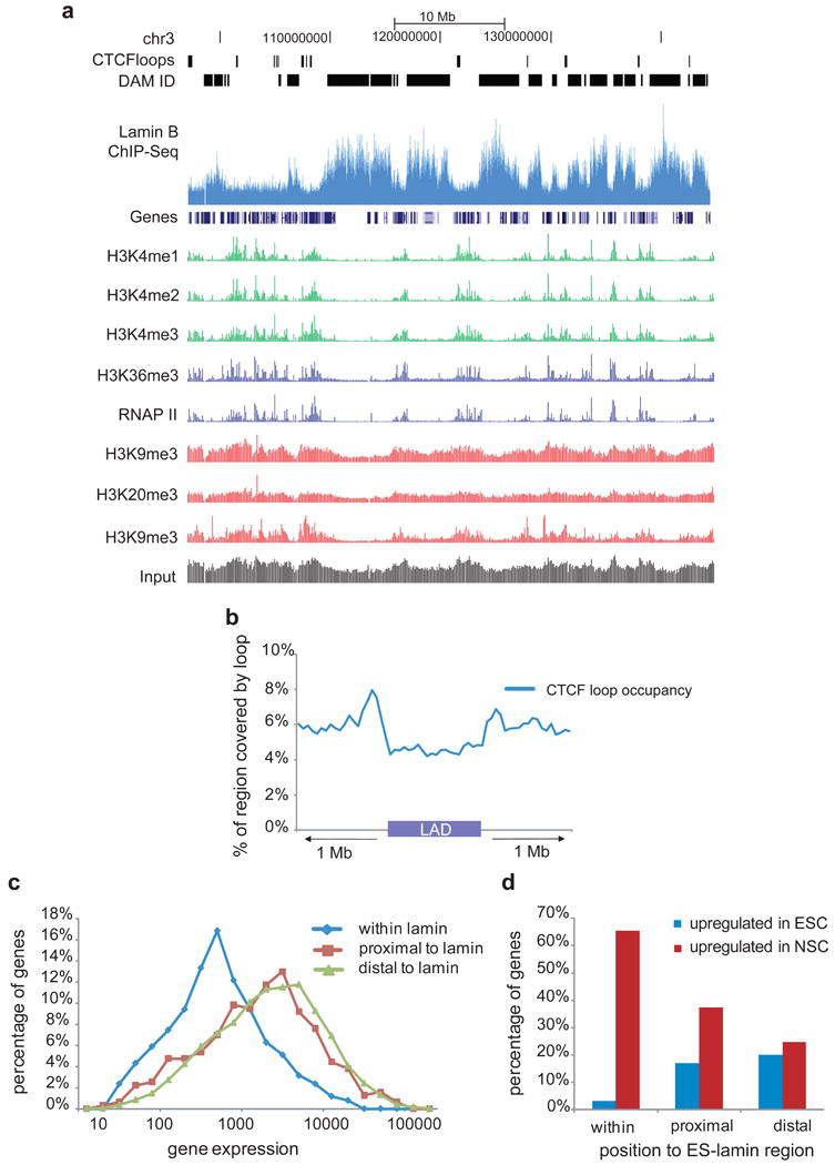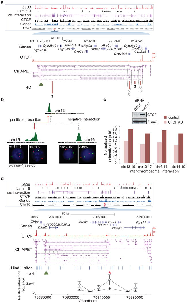 Mammalian genomes are viewed as functional organizations that orchestrate spatial and temporal gene regulation. CTCF, the most characterized insulator-binding protein, has been implicated as a key genome organizer. However, little is known about CTCF-associated higher-order chromatin structures at a global scale. Here we applied chromatin interaction analysis by paired-end tag (ChIA-PET) sequencing to elucidate the CTCF-chromatin interactome in pluripotent cells. From this analysis, we identified 1,480 cis- and 336 trans-interacting loci with high reproducibility and precision. Associating these chromatin interaction loci with their underlying epigenetic states, promoter activities, enhancer binding and nuclear lamina occupancy, we uncovered five distinct chromatin domains that suggest potential new models of CTCF function in chromatin organization and transcriptional control. Specifically, CTCF interactions demarcate chromatin-nuclear membrane attachments and influence proper gene expression through extensive cross-talk between promoters and regulatory elements. This highly complex nuclear organization offers insights toward the unifying principles that govern genome plasticity and function.