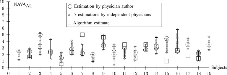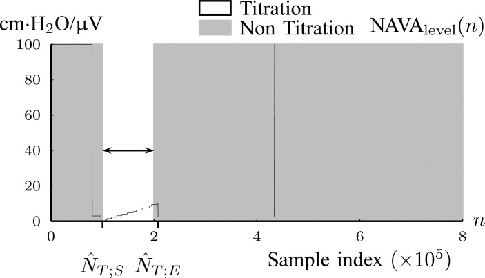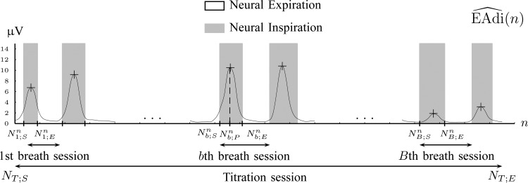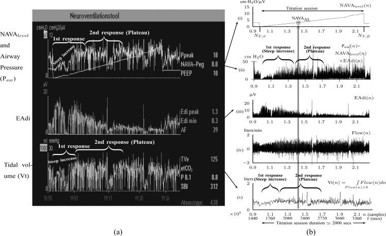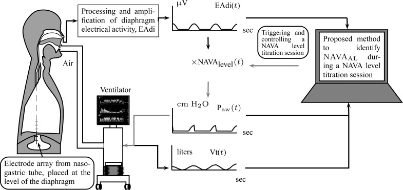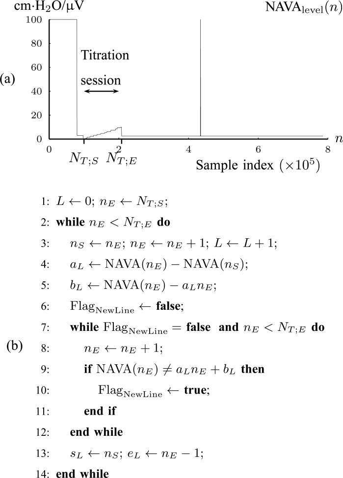Neurally adjusted ventilatory assist (NAVA) delivers airway pressure (P(aw)) in proportion to the electrical activity of the diaphragm (EAdi) using an adjustable proportionality constant (NAVA level, cm·H(2)O/μV). During systematic increases in the NAVA level, feedback-controlled down-regulation of the EAdi results in a characteristic two-phased response in P(aw) and tidal volume (Vt). The transition from the 1st to the 2nd response phase allows identification of adequate unloading of the respiratory muscles with NAVA (NAVA(AL)). We aimed to develop and validate a mathematical algorithm to identify NAVA(AL). P(aw), Vt, and EAdi were recorded while systematically increasing the NAVA level in 19 adult patients. In a multistep approach, inspiratory P(aw) peaks were first identified by dividing the EAdi into inspiratory portions using Gaussian mixture modeling. Two polynomials were then fitted onto the curves of both P(aw) peaks and Vt. The beginning of the P(aw) and Vt plateaus, and thus NAVA(AL), was identified at the minimum of squared polynomial derivative and polynomial fitting errors. A graphical user interface was developed in the Matlab computing environment. Median NAVA(AL) visually estimated by 18 independent physicians was 2.7 (range 0.4 to 5.8) cm·H(2)O/μV and identified by our model was 2.6 (range 0.6 to 5.0) cm·H(2)O/μV. NAVA(AL) identified by our model was below the range of visually estimated NAVA(AL) in two instances and was above in one instance. We conclude that our model identifies NAVA(AL) in most instances with acceptable accuracy for application in clinical routine and research.