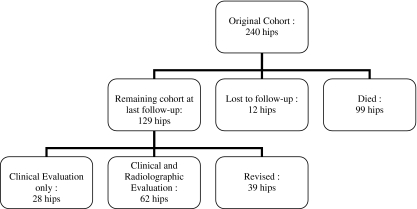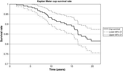 Results: The 22-year follow-up global survival rate was 74%. No dislocation occurred, 41 hips were revised, including ten retentive failures (RF), 12 hips were lost to follow-up, 87 patients (99 hips) died without revision, and 90 hips were still in situ.