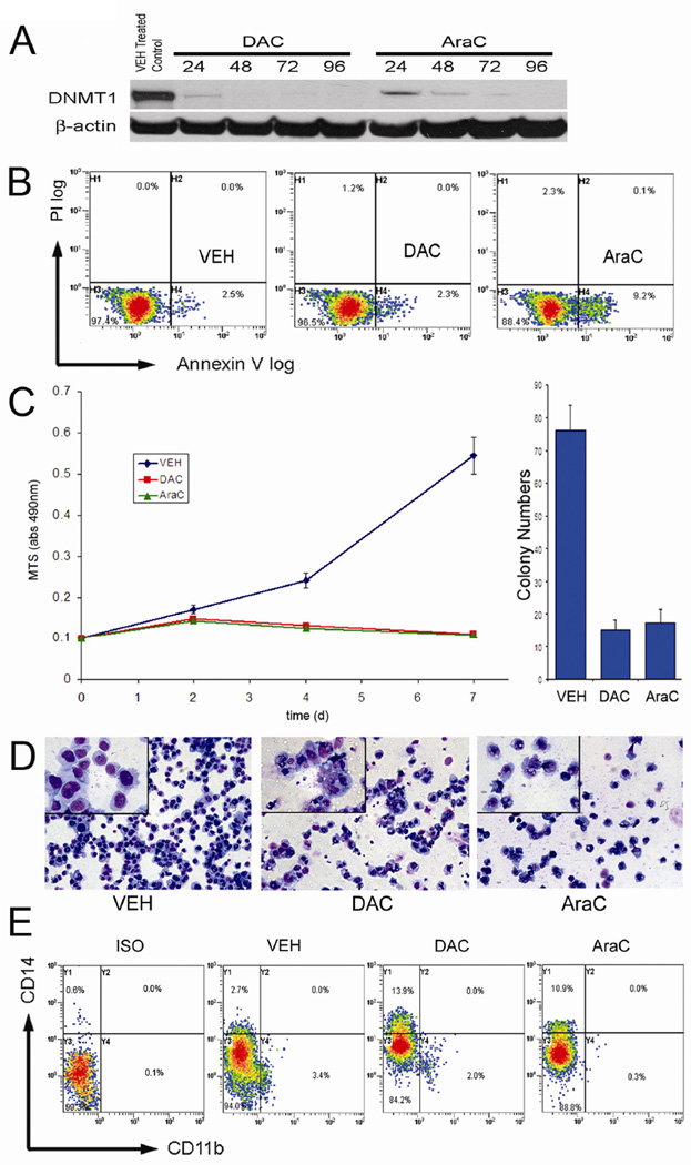 Suppression of apoptosis by TP53 mutation contributes to resistance of acute myeloid leukemia (AML) to conventional cytotoxic treatment. Using differentiation to induce irreversible cell cycle exit in AML cells could be a p53-independent treatment alternative, however, this possibility requires evaluation. In vitro and in vivo regimens of the deoxycytidine analogue decitabine that deplete the chromatin-modifying enzyme DNA methyl-transferase 1 without phosphorylating p53 or inducing early apoptosis were determined. These decitabine regimens but not equimolar DNA-damaging cytarabine upregulated the key late differentiation factors CCAAT enhancer-binding protein ɛ and p27/cyclin dependent kinase inhibitor 1B (CDKN1B), induced cellular differentiation and terminated AML cell cycle, even in cytarabine-resistant p53- and p16/CDKN2A-null AML cells. Leukemia initiation by xenotransplanted AML cells was abrogated but normal hematopoietic stem cell engraftment was preserved. In vivo, the low toxicity allowed frequent drug administration to increase exposure, an important consideration for S phase specific decitabine therapy. In xenotransplant models of p53-null and relapsed/refractory AML, the non-cytotoxic regimen significantly extended survival compared with conventional cytotoxic cytarabine. Modifying in vivo dose and schedule to emphasize this pathway of decitabine action can bypass a mechanism of resistance to standard therapy.