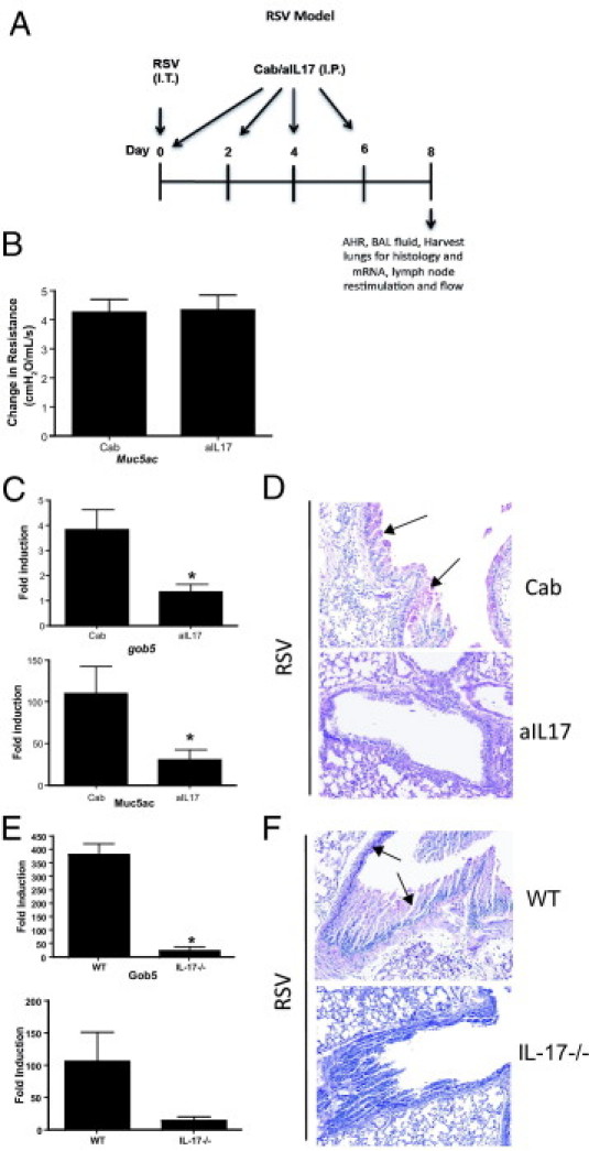 Severe respiratory syncytial virus (RSV) infections are characterized by airway epithelial cell damage, mucus hypersecretion, and Th2 cytokine production. Less is known about the role of IL-17. We observed increased IL-6 and IL-17 levels in tracheal aspirate samples from severely ill infants with RSV infection. In a mouse model of RSV infection, time-dependent increases in pulmonary IL-6, IL-23, and IL-17 expression were observed. Neutralization of IL-17 during infection and observations from IL-17(-/-) knockout mice resulted in significant inhibition of mucus production during RSV infection. RSV-infected animals treated with anti-IL-17 had reduced inflammation and decreased viral load, compared with control antibody-treated mice. Blocking IL-17 during infection resulted in significantly increased RSV-specific CD8 T cells. Factors associated with CD8 cytotoxic T lymphocytes, T-bet, IFN-γ, eomesodermin, and granzyme B were significantly up-regulated after IL-17 blockade. Additionally, in vitro analyses suggest that IL-17 directly inhibits T-bet, eomesodermin, and IFN-γ in CD8 T cells. The role of IL-17 was also investigated in RSV-induced exacerbation of allergic airway responses, in which neutralization of IL-17 led to a significant decrease in the exacerbated disease, including reduced mucus production and Th2 cytokines, with decreased viral proteins. Taken together, our data demonstrate that IL-17 plays a pathogenic role during RSV infections.