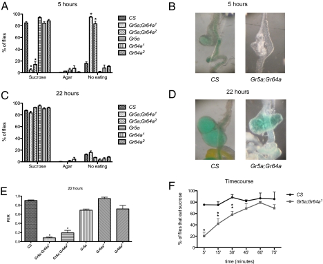 Feeding behavior is influenced primarily by two factors: nutritional needs and food palatability. However, the role of food deprivation and metabolic needs in the selection of appropriate food is poorly understood. Here, we show that the fruit fly, Drosophila melanogaster, selects calorie-rich foods following prolonged food deprivation in the absence of taste-receptor signaling. Flies mutant for the sugar receptors Gr5a and Gr64a cannot detect the taste of sugar, but still consumed sugar over plain agar after 15 h of starvation. Similarly, pox-neuro mutants that are insensitive to the taste of sugar preferentially consumed sugar over plain agar upon starvation. Moreover, when given a choice between metabolizable sugar (sucrose or D-glucose) and nonmetabolizable (zero-calorie) sugar (sucralose or L-glucose), starved Gr5a; Gr64a double mutants preferred metabolizable sugars. These findings suggest the existence of a taste-independent metabolic sensor that functions in food selection. The preference for calorie-rich food correlates with a decrease in the two main hemolymph sugars, trehalose and glucose, and in glycogen stores, indicating that this sensor is triggered when the internal energy sources are depleted. Thus, the need to replenish depleted energy stores during periods of starvation may be met through the activity of a taste-independent metabolic sensing pathway.