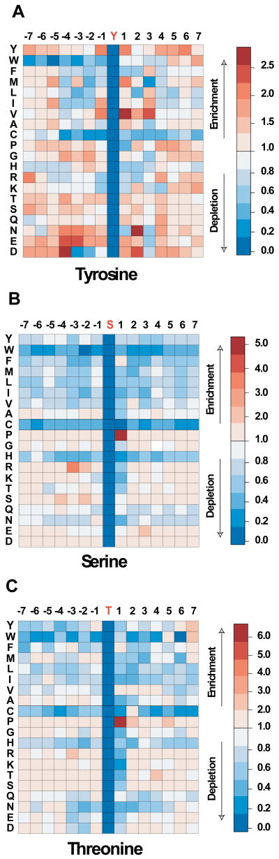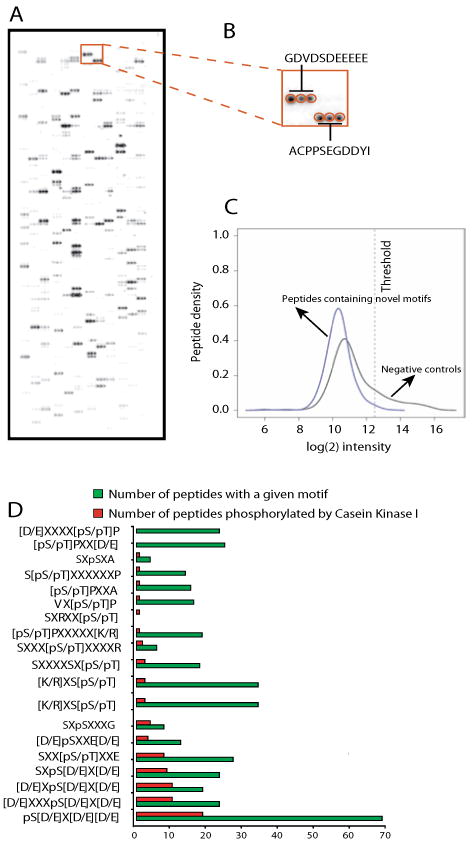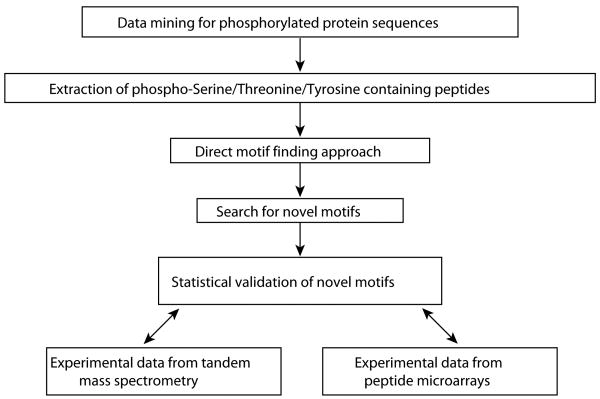 Protein phosphorylation occurs in certain sequence/structural contexts that are still incompletely understood. The amino acids surrounding the phosphorylated residues are important in determining the binding of the kinase to the protein sequence. Upon phosphorylation these sequences also determine the binding of certain domains that specifically bind to phosphorylated sequences. Thus far, such 'motifs' have been identified through alignment of a limited number of well identified kinase substrates. RESULTS: Experimentally determined phosphorylation sites from Human Protein Reference Database were used to identify 1,167 novel serine/threonine or tyrosine phosphorylation motifs using a computational approach. We were able to statistically validate a number of these novel motifs based on their enrichment in known phosphopeptides datasets over phosphoserine/threonine/tyrosine peptides in the human proteome. There were 299 novel serine/threonine or tyrosine phosphorylation motifs that were found to be statistically significant. Several of the novel motifs that we identified computationally have subsequently appeared in large datasets of experimentally determined phosphorylation sites since we initiated our analysis. Using a peptide microarray platform, we have experimentally evaluated the ability of casein kinase I to phosphorylate a subset of the novel motifs discovered in this study. Our results demonstrate that it is feasible to identify novel phosphorylation motifs through large phosphorylation datasets. Our study also establishes peptide microarrays as a novel platform for high throughput kinase assays and for the validation of consensus motifs. Finally, this extended catalog of phosphorylation motifs should assist in a systematic study of phosphorylation networks in signal transduction pathways.