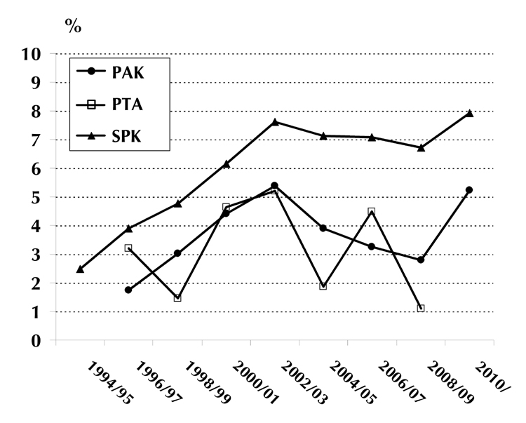 Results: Pancreas transplantations in diabetic patients were divided into 3 categories: those performed simultaneously with a kidney (SPK) (75%), those given after a previous kidney transplantation (PAK) (18%), and pancreas transplantation alone (PTA) (7%). The total number of pancreas transplantations steadily increased until 2004 but has since declined. The largest decrease was seen in PAK, which decreased by 50% from 2004 through 2010. Comparatively, the number of SPK decreased by 7% during this time. Era analysis of US transplantations between 1987 and 2010 showed changes in recipient and donor characteristics. Recipient age at transplantation increased significantly as well as transplantations in type 2 diabetes patients. The trend over time was towards tighter donor criteria. There was a concentration on younger donors, preferable trauma victims, with short preservation time. Surgical techniques for the drainage of the pancreatic duct changed over time, too. Now enteric drainage is the predominantly used technique in combination with systemic drainage of the venous effluent of the pancreas graft. Immunosuppressive protocols developed towards antibody induction therapy with tacrolimus and MMF as maintenance therapy. The rate of transplantations with steroid avoidance increased over time in all 3 categories. These changes have led to improved patient and graft survival. Patient survival now reaches over 95% at one year post-transplant and over 83% after 5 years. The best graft survival was found in SPK with 86% pancreas and 93% kidney graft function at one year. PAK pancreas graft function reached 80%, and PTA pancreas graft function reached 78% at one year. In all 3 categories, early technical graft loss rates decreased significantly to 8-9%. Likewise, the 1-year immunological graft loss rate also decreased: in SPK, the immunological 1-year graft loss rate was 1.8%, in PAK 3.7%, and in PTA 6.0%.