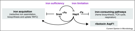 The opportunistic fungal pathogen Aspergillus fumigatus adapts to iron limitation by upregulation of iron uptake mechanisms including siderophore biosynthesis and downregulation of iron-consuming pathways to spare iron. These metabolic changes depend mainly on the transcription factor HapX. Consistent with the crucial role of iron in pathophysiology, genetic inactivation of either HapX or the siderophore system attenuates virulence of A. fumigatus in a murine model of aspergillosis. The differences in iron handling between mammals and fungi might serve to improve therapy and diagnosis of fungal infections.