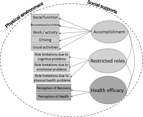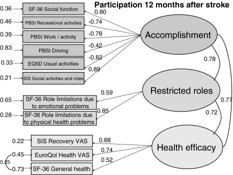 Results: The 12-month post stroke participation model consisted of latent variables: accomplishment, restricted roles, and health efficacy. The model fit was reasonable: normed χ(2) = 2.95, RMSEA = 0.066(0.052; 0.079). The qualitative data verified the model; participants initiated photo-taking and discussion of all aspects of the model. Concepts of social support, environment, and cognitive difficulties were also discussed in relation to participation.