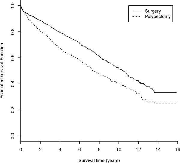 Results: Surgical resection was performed in 1340 (64.5%) patients and polypectomy was performed in 737 (35.5%) patients. Predictors for undergoing polypectomy (P<.001) included older age, greater comorbidity, no history of polyps, diagnosis in 2002 or later, left colon site of cancer, well-differentiated tumors, and colonoscopy performed in an outpatient setting. Both 1-year and 5-year survival were higher in the surgical group (92% and 75%, respectively) than in the polypectomy group (88% and 62%, respectively). The unadjusted hazard ratio was 1.51 (95% confidence interval [CI], 1.31-1.74). After adjusting for propensity quintile, the hazard ratio was 1.15 (95% CI, 0.98-1.33). Within each propensity quintile, the risk of death was similar between the 2 groups (interaction test P = .96).