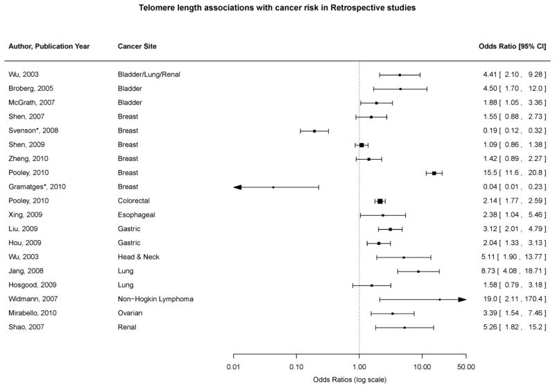 Telomeres, the dynamic nucleoprotein structures at the ends of linear chromosomes, maintain the genomic integrity of a cell. Telomere length shortens with age due to the incomplete replication of DNA ends with each cell division as well as damage incurred by oxidative stress. Patterns of telomere shortening, genomic instability, and telomerase expression in many cancer tissues compared to adjacent normal tissue implicate telomere crisis as a common crucial event in malignant transformation. In order to understand the role of telomere length in cancer etiology, most epidemiologic studies have measured average telomere length of peripheral blood or buccal cell DNA as a surrogate tissue biomarker of telomere dysfunction and cancer risk. In this review, we present the results from epidemiologic investigations conducted of telomere length and cancer risk. We note differences in reported associations based on study design, which may be due to biases intrinsic to retrospective studies. Finally, we conclude with study design considerations as future investigations are needed to elucidate the relationship between telomere length and a number of cancer sites.