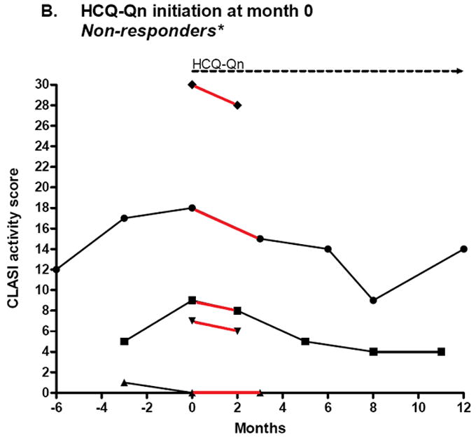 Results: Of 11 patients who initiated treatment with hydroxychloroquine, 55% were responders (n = 6), showing a decrease in median (interquartile range [IQR]) activity score from 8.0 (3.5-13.0) to 3.0 (1.8-7.3) (P = .03). Of 15 patients for whom hydroxychloroquine failed, 67% were responders to initiation of hydroxychloroquine-quinacrine therapy (n = 10), showing a decrease in median (IQR) activity score from 6.0 (4.8-8.3) to 3.0 (0.75-5.0) (P = .004). Nine of 21 patients who continued hydroxychloroquine treatment (43%), and 9 of 21 patients who continued hydroxychloroquine-quinacrine (43%) were responders, showing a decrease in median (IQR) activity score from 6.0 (1.5-9.5) to 1.0 (0.0-4.5) (P = .01) and 8.5 (4.25-17.5) to 5.0 (0.5-11.5) (P = .01), respectively.