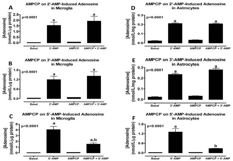 Many organs express the extracellular 3',5'-cAMP-adenosine pathway (conversion of extracellular 3',5'-cAMP to 5'-AMP and 5'-AMP to adenosine). Some organs release 2',3'-cAMP (isomer of 3',5'-cAMP) and convert extracellular 2',3'-cAMP to 2'- and 3'-AMP and convert these AMPs to adenosine (extracellular 2',3'-cAMP-adenosine pathway). As astrocytes and microglia are important participants in the response to brain injury and adenosine is an endogenous neuroprotectant, we investigated whether these extracellular cAMP-adenosine pathways exist in these cell types. 2',3'-, 3',5'-cAMP, 5'-, 3'-, and 2'-AMP were incubated with mouse primary astrocytes or primary microglia for 1 h and purine metabolites were measured in the medium by mass spectrometry. There was little evidence of a 3',5'-cAMP-adenosine pathway in either astrocytes or microglia. In contrast, both cell types converted 2',3'-cAMP to 2'- and 3'-AMP (with 2'-AMP being the predominant product). Although both cell types converted 2'- and 3'-AMP to adenosine, microglia were five- and sevenfold, respectively, more efficient than astrocytes in this regard. Inhibitor studies indicated that the conversion of 2',3'-cAMP to 2'-AMP was mediated by a different ecto-enzyme than that involved in the metabolism of 2',3'-cAMP to 3'-AMP and that although CD73 mediates the conversion of 5'-AMP to adenosine, an alternative ecto-enzyme metabolizes 2'- or 3'-AMP to adenosine.