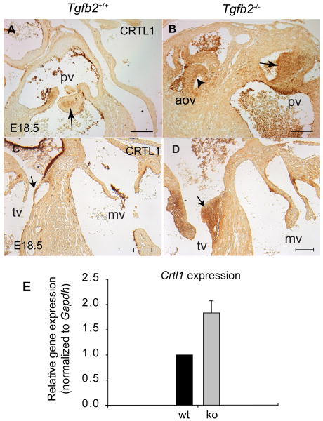 Although the function of transforming growth factor beta2 (TGFβ2) in epithelial mesenchymal transition (EMT) is well studied, its role in valve remodeling remains to be fully explored. Here, we used histological, morphometric, immunohistochemical and molecular approaches and showed that significant dysregulation of major extracellular matrix (ECM) components contributed to valve remodeling defects in Tgfb2(-/-) embryos. The data indicated that cushion mesenchymal cell differentiation was impaired in Tgfb2(-/-) embryos. Hyaluronan and cartilage link protein-1 (CRTL1) were increased in hyperplastic valves of Tgfb2(-/-) embryos, indicating increased expansion and diversification of cushion mesenchyme into the cartilage cell lineage during heart development. Finally, Western blot and immunohistochemistry analyses indicate that the activation of SMAD2/3 was decreased in Tgfb2(-/-) embryos during valve remodeling. Collectively, the data indicate that TGFβ2 promotes valve remodeling and differentiation by inducing matrix organization and suppressing cushion mesenchyme differentiation into cartilage cell lineage during heart development.