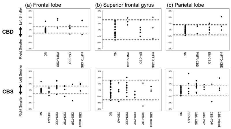 Methods: We reviewed clinical and magnetic resonance imaging data in all patients evaluated at our center with either an autopsy diagnosis of CBD (n = 18) or clinical CBS at first presentation with known histopathology (n = 40). Atrophy patterns were compared using voxel-based morphometry.