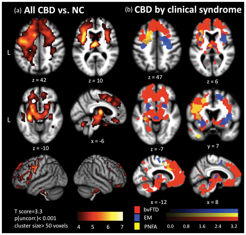 Results: CBD was associated with 4 clinical syndromes: progressive nonfluent aphasia (n = 5), behavioral variant frontotemporal dementia (n = 5), executive-motor (n = 7), and posterior cortical atrophy (n = 1). Behavioral or cognitive problems were the initial symptoms in 15 of 18 patients; less than half exhibited early motor findings. Compared to controls, CBD patients showed atrophy in dorsal prefrontal and perirolandic cortex, striatum, and brainstem (p < 0.001 uncorrected). The most common pathologic substrates for clinical CBS were CBD (35%), Alzheimer disease (AD, 23%), progressive supranuclear palsy (13%), and frontotemporal lobar degeneration (FTLD) with TDP inclusions (13%). CBS was associated with perirolandic atrophy irrespective of underlying pathology. In CBS due to FTLD (tau or TDP), atrophy extended into prefrontal cortex, striatum, and brainstem, whereas in CBS due to AD, atrophy extended into temporoparietal cortex and precuneus (p < 0.001 uncorrected).