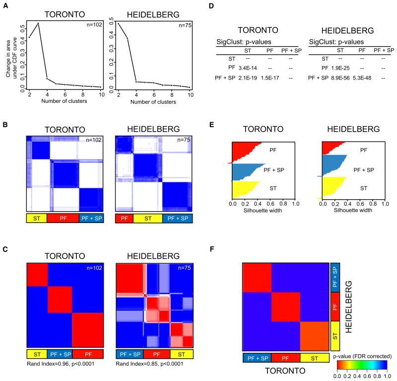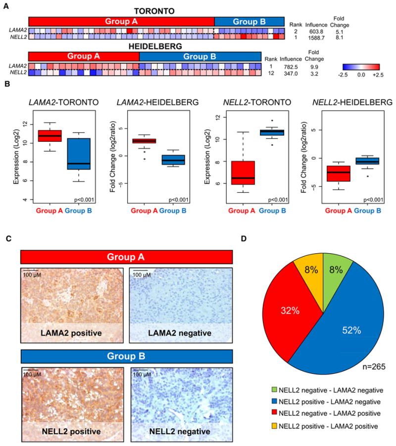 Despite the histological similarity of ependymomas from throughout the neuroaxis, the disease likely comprises multiple independent entities, each with a distinct molecular pathogenesis. Transcriptional profiling of two large independent cohorts of ependymoma reveals the existence of two demographically, transcriptionally, genetically, and clinically distinct groups of posterior fossa (PF) ependymomas. Group A patients are younger, have laterally located tumors with a balanced genome, and are much more likely to exhibit recurrence, metastasis at recurrence, and death compared with Group B patients. Identification and optimization of immunohistochemical (IHC) markers for PF ependymoma subgroups allowed validation of our findings on a third independent cohort, using a human ependymoma tissue microarray, and provides a tool for prospective prognostication and stratification of PF ependymoma patients.