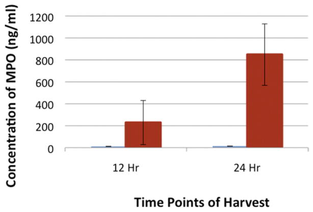Materials and methods: C57BL/6 mice were catheterized/instilled with LL-37 (320 μM, 150 μl) for 45 minutes. Animals were sacrificed at 12 and 24 hours, and tissues were examined using hematoxylin and eosin. Separate experiments were performed for myeloperoxidase to quantify inflammation. GM-1111 semi-synthetic glycosaminoglycan ether treatments involved instillation of 10 mg/ml for 45 minutes directly before or after LL-37. Tissues were harvested at 24 hours. To compare semi-synthetic glycosaminoglycan ether efficacy, experiments were performed using 10 mg/ml heparin. Finally, tissue localization of semi-synthetic glycosaminoglycan ether was examined using a fluorescent GM-1111-Alexa Fluor® 633 conjugate.
