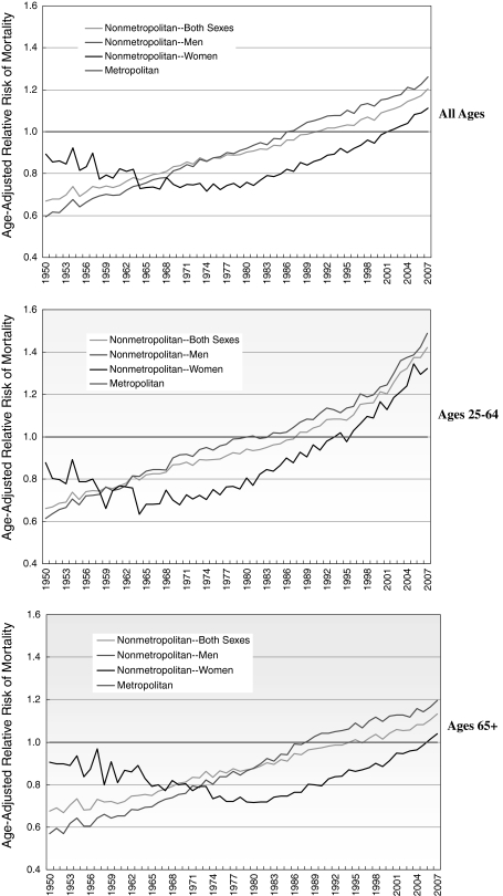 This study examined disparities in lung cancer mortality rates among US men and women in metropolitan and non-metropolitan areas from 1950 through 2007. Annual age-adjusted mortality rates were calculated for men and women in metropolitan and non-metropolitan areas, and differences in mortality rates were tested for statistical significance. Log-linear regression was used to model annual rates of change in mortality over time, while Poisson regression was used to estimate relative risk after adjusting for age, sex, deprivation, and urbanization levels. Urbanization patterns in lung cancer mortality changed dramatically between 1950 and 2007. Compared to men in metropolitan areas, men aged 25-64 years in non-metropolitan areas had significantly lower lung cancer mortality rates from 1950 to 1977 and men aged ≥65 years in non-metropolitan areas had lower mortality rates from 1950 to 1985. Differentials began to reverse and widen by the mid-1980s for men and by the mid-1990s for younger women. In 2007, compared to their metropolitan counterparts, men aged 25-64 and ≥65 years in non-metropolitan areas had 49 and 19% higher lung cancer mortality and women aged 25-64 and ≥65 years in non-metropolitan areas had 32 and 4% higher lung cancer mortality, respectively. Although adjustment for deprivation levels reduced excess lung cancer mortality risk among those in non-metropolitan areas, significant rural-urban differences remained. Rural-urban patterns reversed because of faster and earlier reductions in lung cancer mortality among men and women in metropolitan areas. Temporal trends in rural-urban disparities in lung cancer mortality appear to be consistent with those in smoking.