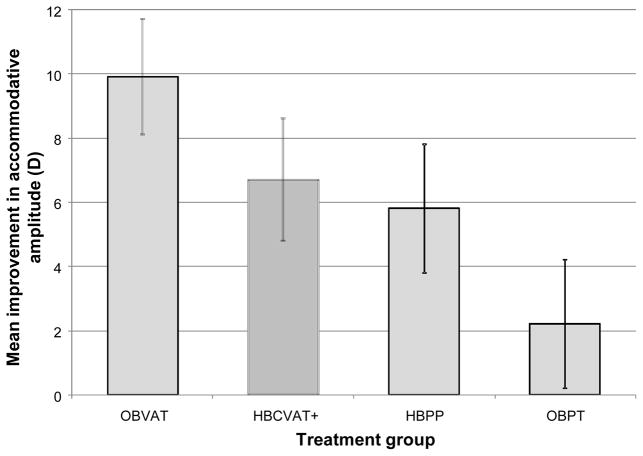 Methods: In a randomized clinical trial, 221 children aged 9 to 17 years with symptomatic CI were assigned to one of four treatments. Of the enrolled children, 164 (74%) had accommodative dysfunction; 63 (29%) had a decreased amplitude of accommodation with respect to age, 43 (19%) had decreased accommodative facility, and 58 (26%) had both. Analysis of variance models were used to compare mean accommodative amplitude and accommodative facility for each treatment group after 4, 8, and 12 weeks of treatment.