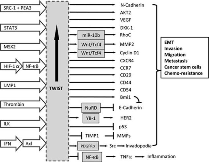 This article reviews the molecular structure, expression pattern, physiological function, pathological roles and molecular mechanisms of Twist1 in development, genetic disease and cancer. Twist1 is a basic helix-loop-helix domain-containing transcription factor. It forms homo- or hetero-dimers in order to bind the Nde1 E-box element and activate or repress its target genes. During development, Twist1 is essential for mesoderm specification and differentiation. Heterozygous loss-of-function mutations of the human Twist1 gene cause several diseases including the Saethre-Chotzen syndrome. The Twist1-null mouse embryos die with unclosed cranial neural tubes and defective head mesenchyme, somites and limb buds. Twist1 is expressed in breast, liver, prostate, gastric and other types of cancers, and its expression is usually associated with invasive and metastatic cancer phenotypes. In cancer cells, Twist1 is upregulated by multiple factors including SRC-1, STAT3, MSX2, HIF-1α, integrin-linked kinase and NF-κB. Twist1 significantly enhances epithelial-mesenchymal transition (EMT) and cancer cell migration and invasion, hence promoting cancer metastasis. Twist1 promotes EMT in part by directly repressing E-cadherin expression by recruiting the nucleosome remodeling and deacetylase complex for gene repression and by upregulating Bmi1, AKT2, YB-1, etc. Emerging evidence also suggests that Twist1 plays a role in expansion and chemotherapeutic resistance of cancer stem cells. Further understanding of the mechanisms by which Twist1 promotes metastasis and identification of Twist1 functional modulators may hold promise for developing new strategies to inhibit EMT and cancer metastasis.