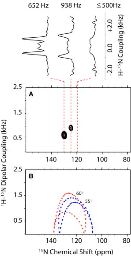 The amphipathic antimicrobial peptide piscidin 1 was studied in magnetically aligned phospholipid bilayers by oriented-sample solid-state NMR spectroscopy. (31)P NMR and double-resonance (1)H/(15)N NMR experiments performed between 25 °C and 61 °C enabled the lipid headgroups as well as the peptide amide sites to be monitored over a range of temperatures. The α-helical peptide dramatically affects the phase behavior and structure of anionic bilayers but not those of zwitterionic bilayers. Piscidin 1 stabilizes anionic bilayers, which remain well aligned up to 61 °C when piscidin 1 is on the membrane surface. Two-dimensional separated-local-field experiments show that the tilt angle of the peptide is 80 ± 5°, in agreement with previous results on mechanically aligned bilayers. The peptide undergoes fast rotational diffusion about the bilayer normal under these conditions, and these studies demonstrate that magnetically aligned bilayers are well suited for structural studies of amphipathic peptides.