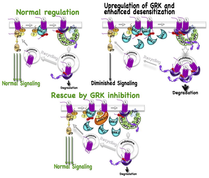 G protein-coupled receptor (GPCR) kinases (GRKs) are best known for their role in homologous desensitization of GPCRs. GRKs phosphorylate activated receptors and promote high affinity binding of arrestins, which precludes G protein coupling. GRKs have a multidomain structure, with the kinase domain inserted into a loop of a regulator of G protein signaling homology domain. Unlike many other kinases, GRKs do not need to be phosphorylated in their activation loop to achieve an activated state. Instead, they are directly activated by docking with active GPCRs. In this manner they are able to selectively phosphorylate Ser/Thr residues on only the activated form of the receptor, unlike related kinases such as protein kinase A. GRKs also phosphorylate a variety of non-GPCR substrates and regulate several signaling pathways via direct interactions with other proteins in a phosphorylation-independent manner. Multiple GRK subtypes are present in virtually every animal cell, with the highest expression levels found in neurons, with their extensive and complex signal regulation. Insufficient or excessive GRK activity was implicated in a variety of human disorders, ranging from heart failure to depression to Parkinson's disease. As key regulators of GPCR-dependent and -independent signaling pathways, GRKs are emerging drug targets and promising molecular tools for therapy. Targeted modulation of expression and/or of activity of several GRK isoforms for therapeutic purposes was recently validated in cardiac disorders and Parkinson's disease.