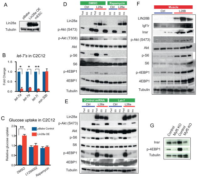 The let-7 tumor suppressor microRNAs are known for their regulation of oncogenes, while the RNA-binding proteins Lin28a/b promote malignancy by inhibiting let-7 biogenesis. We have uncovered unexpected roles for the Lin28/let-7 pathway in regulating metabolism. When overexpressed in mice, both Lin28a and LIN28B promote an insulin-sensitized state that resists high-fat-diet induced diabetes. Conversely, muscle-specific loss of Lin28a or overexpression of let-7 results in insulin resistance and impaired glucose tolerance. These phenomena occur, in part, through the let-7-mediated repression of multiple components of the insulin-PI3K-mTOR pathway, including IGF1R, INSR, and IRS2. In addition, the mTOR inhibitor, rapamycin, abrogates Lin28a-mediated insulin sensitivity and enhanced glucose uptake. Moreover, let-7 targets are enriched for genes containing SNPs associated with type 2 diabetes and control of fasting glucose in human genome-wide association studies. These data establish the Lin28/let-7 pathway as a central regulator of mammalian glucose metabolism.