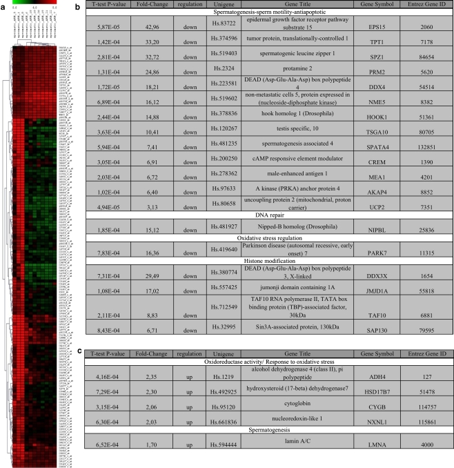 Result(s): We observed up to 33-fold reduction expression of genes involved in spermatogenesis and sperm motility. Furthermore, there is an important decrease in expression of genes involved in DNA repair as well as oxidative stress regulation. In this study, we also show a striking drop in expression of histone modification genes.