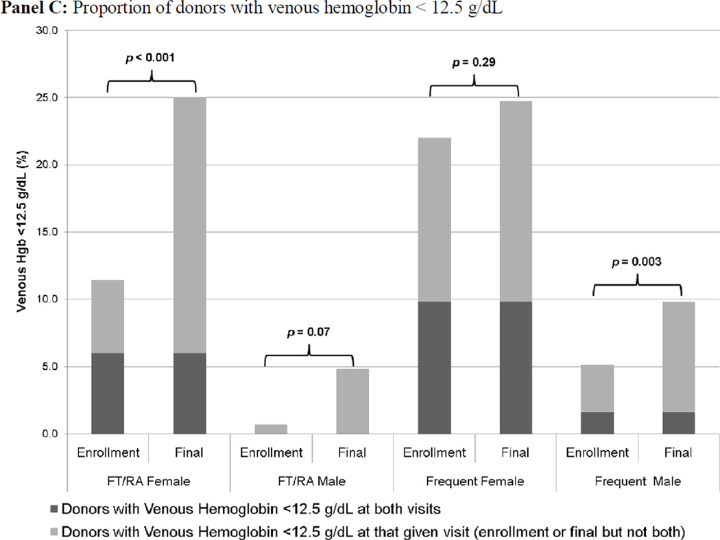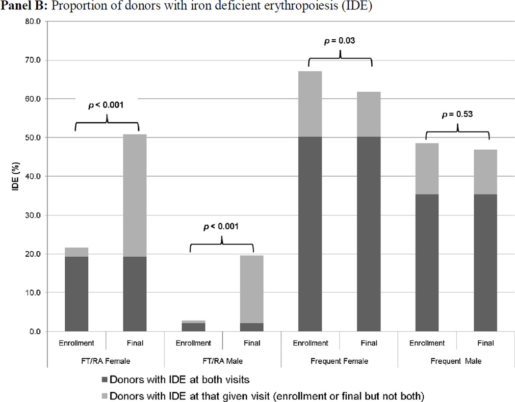 Results: Among returning female FT and RA donors, 20 and 51% had AIS and IDE at their final visit, respectively; corresponding proportions for males were 8 and 20%. Among female frequent donors who returned, 27 and 62% had AIS and IDE, respectively, while corresponding proportions for males were 18 and 47%. Predictors of IDE and/or AIS included a higher frequency of blood donation in the past 2 years, a shorter interdonation interval, and being female and young; conversely, taking iron supplements reduced the risk of iron depletion. Predictors of Hb deferral included female sex, black race, and a shorter interdonation interval.