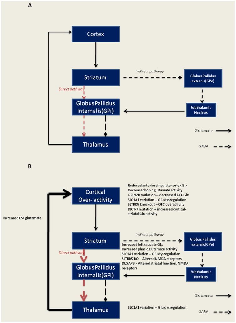 Obsessive-compulsive disorder (OCD) is a common and often debilitating neuropsychiatric condition characterized by persistent intrusive thoughts (obsessions), repetitive ritualistic behaviors (compulsions) and excessive anxiety. While the neurobiology and etiology of OCD has not been fully elucidated, there is growing evidence that disrupted neurotransmission of glutamate within corticalstriatal-thalamocortical (CSTC) circuitry plays a role in OCD pathogenesis. This review summarizes the findings from neuroimaging, animal model, candidate gene and treatment studies in the context of glutamate signaling dysfunction in OCD. First, studies using magnetic resonance spectroscopy are reviewed demonstrating altered glutamate concentrations in the caudate and anterior cingulate cortex of patients with OCD. Second, knockout mouse models, particularly the DLGAP3 and Sltrk5 knockout mouse models, display remarkably similar phenotypes of compulsive grooming behavior associated with glutamate signaling dysfunction. Third, candidate gene studies have identified associations between variants in glutamate system genes and OCD, particularly for SLC1A1 which has been shown to be associated with OCD in five independent studies. This converging evidence for a role of glutamate in OCD has led to the development of novel treatment strategies involving glutamatergic compounds, particularly riluzole and memantine. We conclude the review by outlining a glutamate hypothesis for OCD, which we hope will inform further research into etiology and treatment for this severe neuropsychiatric condition.