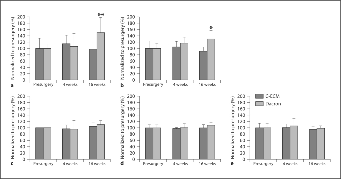Methods and results: A porcine C-ECM patch or Dacron patch was used to reconstruct a full-thickness right ventricular outflow tract (RVOT) defect in a rat model with end points of structural remodeling function at 16 weeks. The Dacron patch was encapsulated by dense fibrous tissue and showed little cellular infiltration. Echocardiographic analysis showed that the right ventricle of the hearts patched with Dacron were dilated at 16 weeks compared to presurgery baseline values. The C-ECM patch remodeled into dense, cellular connective tissue with scattered small islands of cardiomyocytes. The hearts patched with C-ECM showed no difference in the size or function of the ventricles as compared to baseline values at both 4 and 16 weeks.