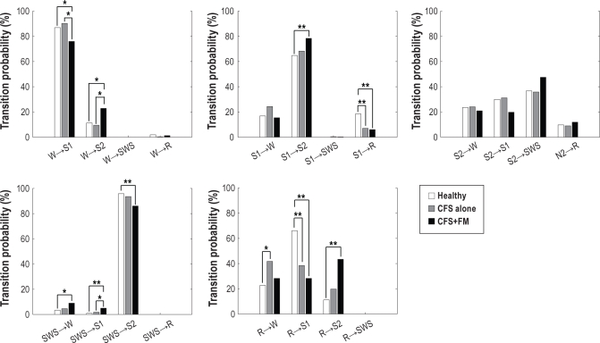 Measurements and results: We studied transition probabilities and rates between sleep stages (waking, rapid eye movement [REM] sleep, stage 1 [S1], stage 2 [S2], and slow-wave sleep [SWS]) and duration distributions of each sleep stage. We found that the probability of transition from REM sleep to waking was significantly greater in subjects with CFS alone than in control subjects, which may be the specific sleep problem for people with CFS alone. Probabilities of (a) transitions from waking, REM sleep, and S1 to S2 and (b) those from SWS to waking and S1 were significantly greater in subjects with CFS+FM than in control subjects; in addition, rates of these transitions were also significantly increased in subjects with CFS+FM. Result (a) might indicate increased sleep pressure in subjects with CFS+FM whereas result (b) may be the specific sleep problem of subjects with CFS+FM. We also found that shorter durations of S2 sleep are specific to patients with CFS+FM, not to CFS alone.