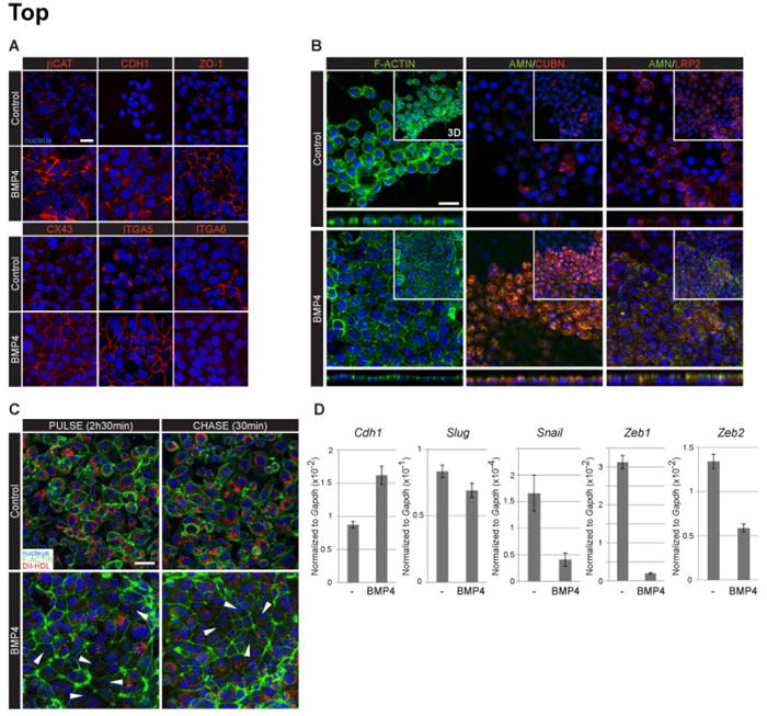 The visceral endoderm (VE) is an epithelial tissue in the early postimplantation mouse embryo that encapsulates the pluripotent epiblast distally and the extraembryonic ectoderm proximally. In addition to facilitating nutrient exchange before the establishment of a circulation, the VE is critical for patterning the epiblast. Since VE is derived from the primitive endoderm (PrE) of the blastocyst, and PrE-derived eXtraembryonic ENdoderm (XEN) cells can be propagated in vitro, XEN cells should provide an important tool for identifying factors that direct VE differentiation. In this study, we demonstrated that BMP4 signaling induces the formation of a polarized epithelium in XEN cells. This morphological transition was reversible, and was associated with the acquisition of a molecular signature comparable to extraembryonic (ex) VE. Resembling exVE which will form the endoderm of the visceral yolk sac, BMP4-treated XEN cells regulated hematopoiesis by stimulating the expansion of primitive erythroid progenitors. We also observed that LIF exerted an antagonistic effect on BMP4-induced XEN cell differentiation, thereby impacting the extrinsic conditions used for the isolation and maintenance of XEN cells in an undifferentiated state. Taken together, our data suggest that XEN cells can be differentiated towards an exVE identity upon BMP4 stimulation and therefore represent a valuable tool for investigating PrE lineage differentiation.